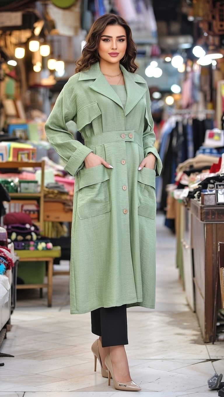 مانتو بلند شانتون زنانه تن پوش شیک مناسب مهمانی روزمره جشن تولد تن پوش شیک و جذاب جنس شانتون خارجی رنگبندی سبز سایز فری سایز